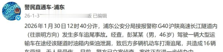 2026年1月30日,是个不寻常的日子,G40沪陕高速上海段,长江隧道里发生大事了,十六辆车撞在一起,你说吓人不吓人,事情大了,直接原因找到了,彭某某开的大车漏油,路太滑了,这可咋整,所有人都觉得他责任大了。
